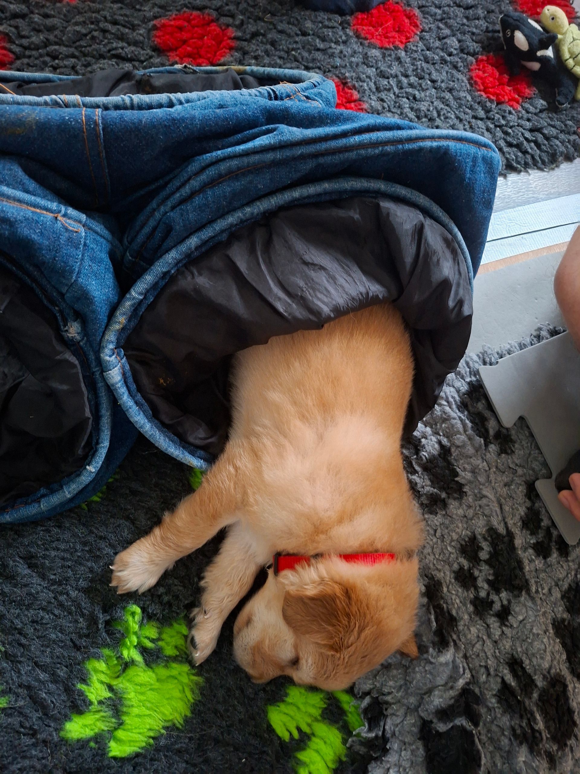 In dieser Woche wurde das Spielgebiet erweitert. Neue Geräte kamen hinzu, die die Welpen neugierig erkundeten und nach und nach immer intensiver unter die Lupe nahmen. Das Spielzeug wurde geschüttelt, herumgetragen und sogar schon apportiert. Auch durch den Tunnel laufen sie schon sicher. Außerdem wird viel umgebaut - die Schlafplätze werden neu gestaltet und Decken durch die Gegend gezogen.
